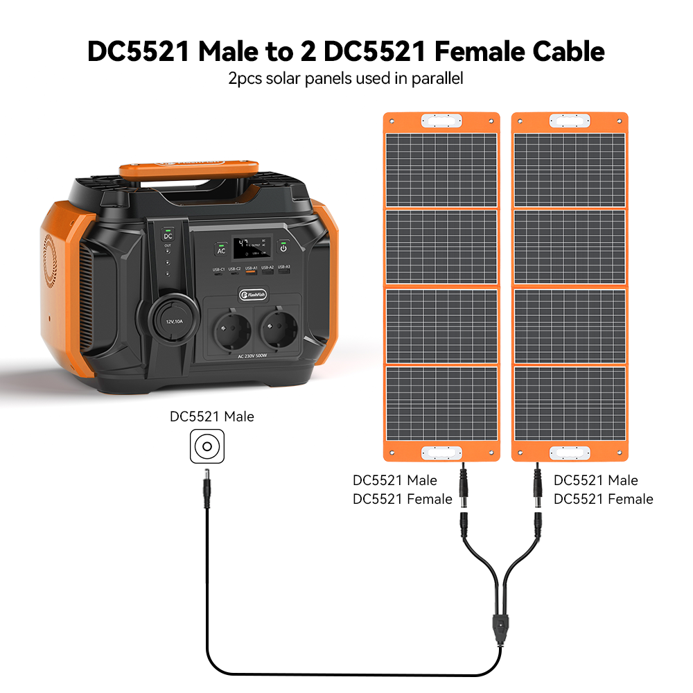 With a DC5521 cable for charging FlashFish / Gofort portable power station;