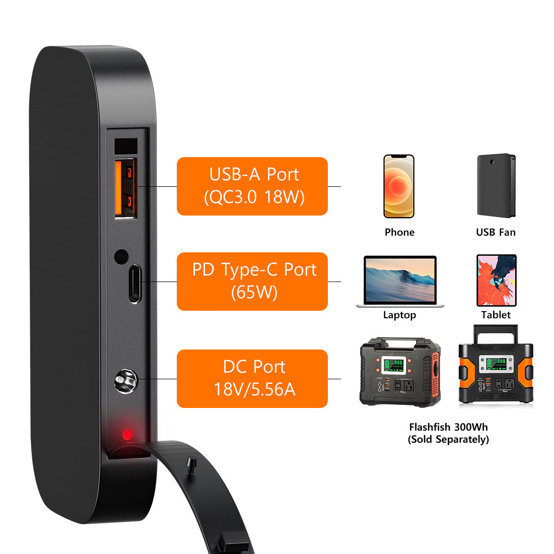 Featured with 1* USB-C(65W) and 1* USB-A(18W) output port, USB-C port support PD charging.